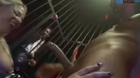 In the depths of an underground chamber, a group of eager men gather for their ultimate fantasy - a mind-blowing experience with a stunning blonde woman in an enclosed chamber, ready to service every one of them.The room is adorned with cages and locks, keeping each man secured as they watch this delectable vision tease them mercilessly.Their eager eyes are fixated on her as she walks around the room, providing a tantalizing show for their eyes to feast upon.Her every curve and movement is accentuated by the tight, seductive clothing that wraps itself around her body like a second skin.Her heart races with anticipation as she slowly begins to make her way from one man's cage to another, taking in their passionate gazes, and knowing just how eager they are for what she is about to provide them.As she reaches the first man, she bends over, offering him easy access to her luscious ass as he jerks his cock faster, getting ready for the blowbang that awaits him.The woman then moves on to a second man, this time turning around and offering her wet, engorged pussy to be filled by another man's eager cock.Her body writhes with pleasure as she takes them all in, one after the other - each man's cock filling a different part of her insatiable holes.She knows that in just a few more moments, it will be time for her grand finale.Finally, reaching the last man trapped in his cage, the blonde goddess mounts him, riding his throbbing cock reverse cowgirl.Her tight pussy clenches around his cock as he drives himself into her with wild abandon.The anticipation of their climax is almost unbearable, but the woman knows she can hold out just a little bit longer.And so she does.As she reaches her peak and starts to milking all the cocks at once, each man in the cage unloads their warm seed deep inside her tight pussy and ass, splattering across her face and tits in a culmination of ecstasy that leaves viewers panting for air.As the room fills with a mixture of sighs, groans, and satisfied gasps, the woman basks in the afterglow, taking the last drops of each man's release onto her skin before releasing it all for one last explosion of her own, sending waves of pleasure coursing through her body as she imagines herself in control of a room full of aroused and submissive men.